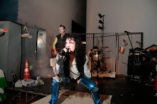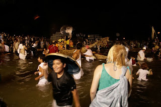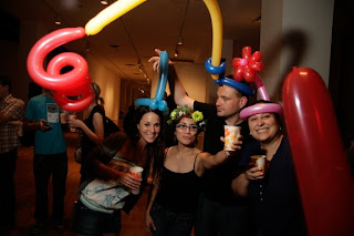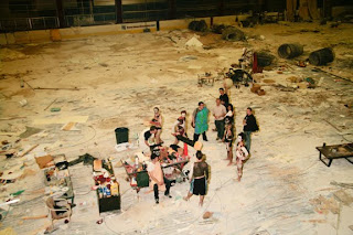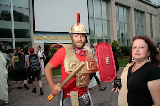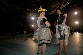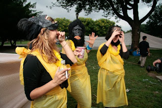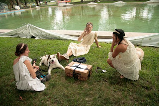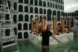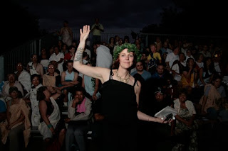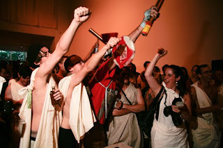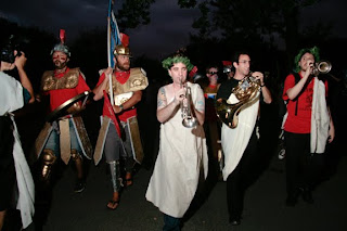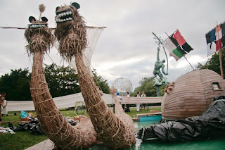 "Those About to Die Salute You, a battle on water wielded with baguette swords and watermelon cannon balls by New York’s art dignitaries, took place on Thursday, August 13, 2009 at 6 pm in a flooded World’s Fair-era reflecting pool in Flushing Meadows Corona Park, just outside of the Queens Museum of Art. Various types of vessels were designed and constructed by artist provocateur Duke Riley and his collaborators: the galleons, some made of reeds harvested in the park, were used to stage a citywide battle of the art museums in which representatives from the Queens Museum of Art, the Brooklyn Museum, Bronx Museum of the Arts, and El Museo del Barrio battled before a toga-clad crowd of frenzied onlookers". Musical Spectacle provided by the Hell-Bent Hookers. - via Queens Museum of Art Website.